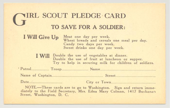 Juliette was living in Scotland when the war broke out and returned to the United States a year later. Her time in Great Britain gave her a close look at what Girl Guides did in service to the war effort and convinced her that Girl Scouts could play a similar role. Long before the United States joined the war, Girl Scouts did their part to support their Girl Guide sisters overseas by knitting garments for Belgian refugees, making dressings for wounds, and fundraising for the Red Cross. As Juliette and Dr. Abby Porter Leland, the national director of Girl Scouts of the USA (GSUSA) in 1917, said in a letter to Girl Scout captains later that year, “The Scout laws and promise are of no value unless translated into deeds of real service.”